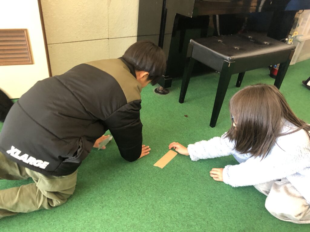 そしてお掃除です。使用した施設を大掃除します。みんなでガムテープを使って、ペタペタお掃除しました!