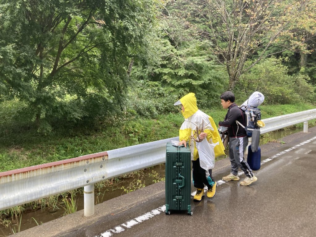 その後、寝袋やテント、釣りセットなどを詰め込み、今回のキャンプ地である鬼谷湖まで歩いて向かいます。