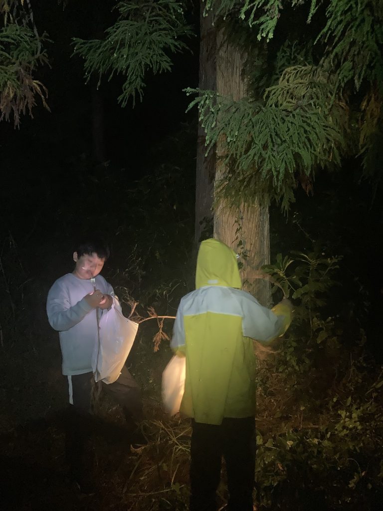 雨がやまない1日でしたが、なんとか乾いているスギの葉や小枝を拾い集め、粘り強く火起こしに挑戦します!